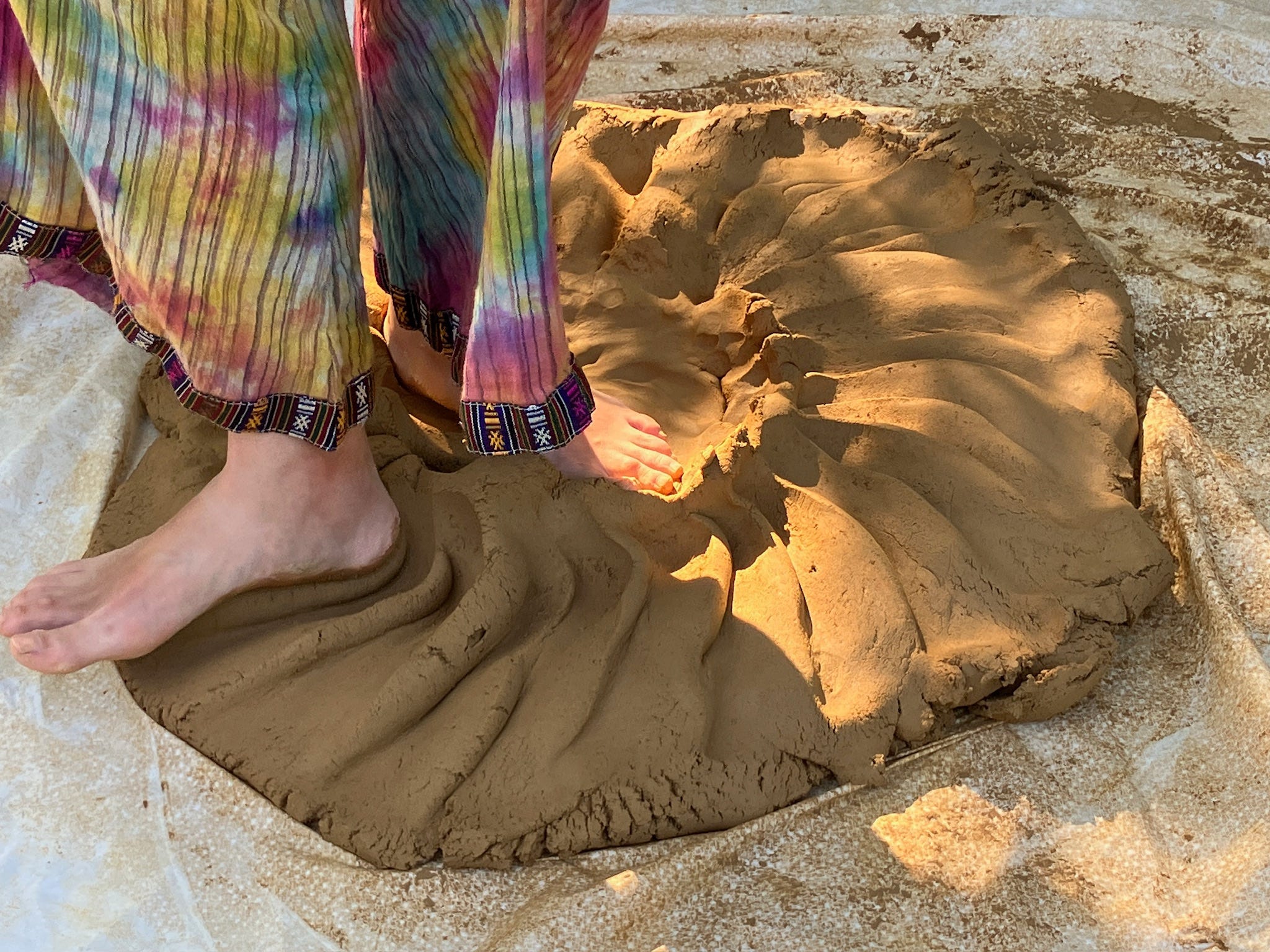 我有一次跟隨大家去採土做泥。就在銀礦灣瀑布旁,大家把一塊布鋪在地上,攤開一團濾乾水後的黃色陶泥,像一塊圓餅。我們背對背站成圓圈,雙腳順時針有節奏地在泥土上踩出紋路。我們像一群原始人在跳著儀式舞。這是我們的土地、我們的社群。