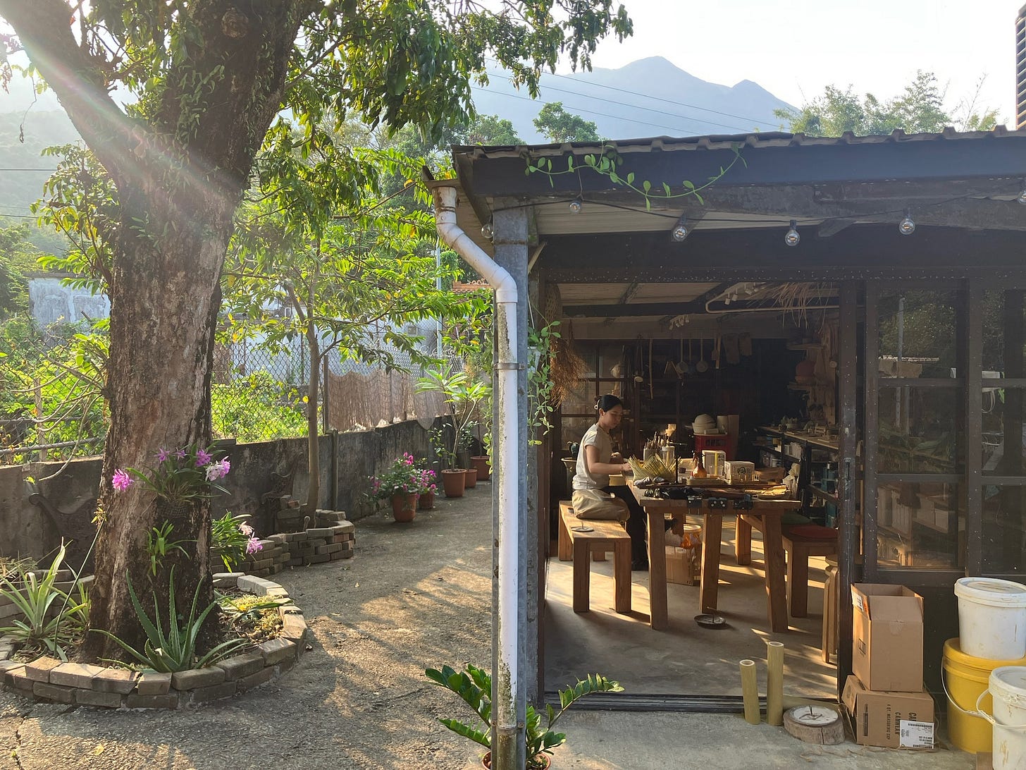 那是一間在蓮花山腳下、小溪旁邊的小屋。屋前,有黃皮樹和芒果樹、一塊小田地。一條梯子從花園裡通往小溪,炎炎夏日可以跳下去把腳放進冰涼的水裡。屋內則是另一個天地,陽光透過長長的天窗一寸寸移動,照亮木櫥櫃裡自己做的各種各樣的陶器,和角落裡茂盛生長的植物。貓和狗好奇地走來走去。從農場剛摘下來的南瓜擺在廚房桌上。野薑花在瓶中盛開。